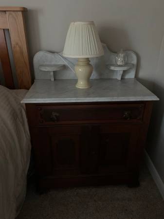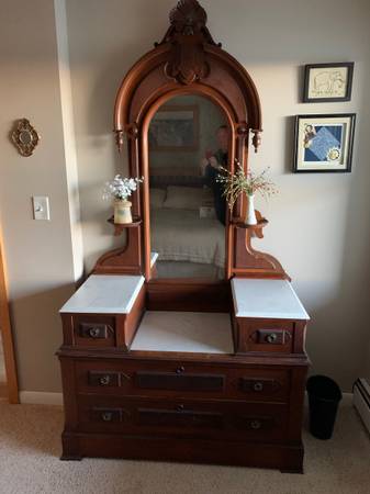 Marble top dresser set. Large dresser and mirror with a smaller dresser that could serve as a wash stand next to bed. Both are antiques and in good shape. Nothing missing.