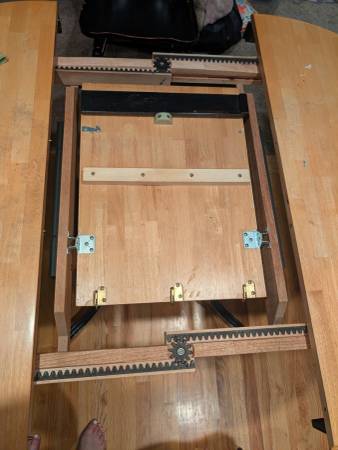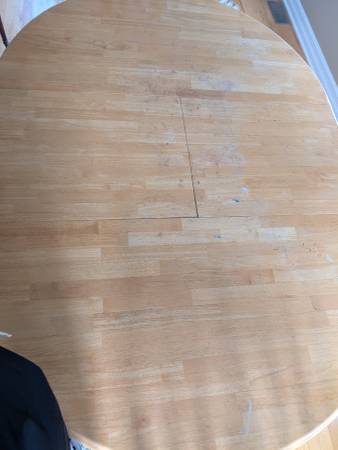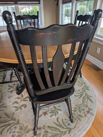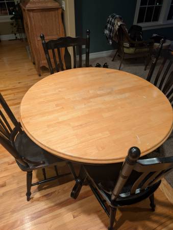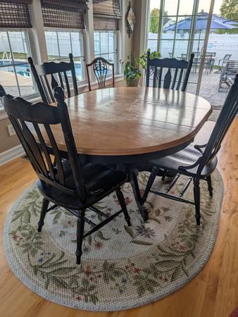 48" Round two tone table with 4 chairs. Table top is light oak wood and bottom is black wood. Table has built in stored leaf that expands the table to 66" x 48". This set is in good condition and well loved serving family dinners for the last 20 years. The table top is slightly damaged, but could be buffed and/or restored by the right person.