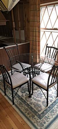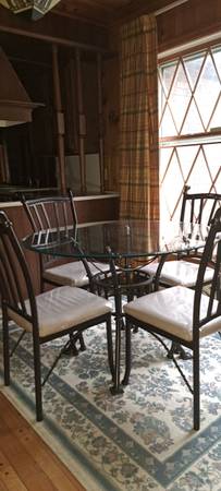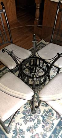 Like new glass top table with 4 wrought iron chairs. Chair cushions have been covered and protected with plastic.