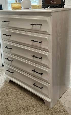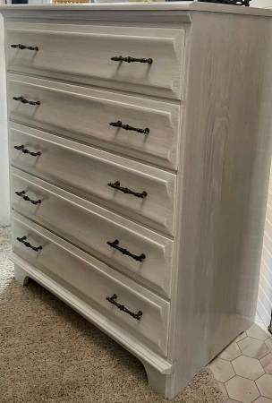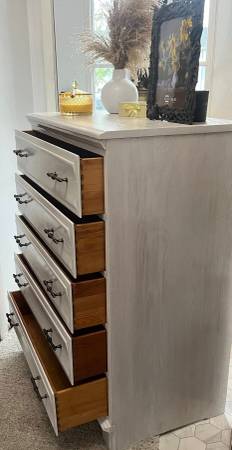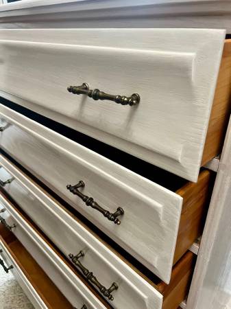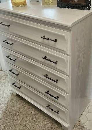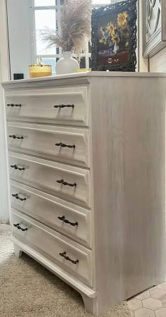 This dresser is made of SOLID WOOD. It had been refurbished like new. Sanded, stained, sealed and ready to go. Capable of withstanding many years of use. The knobs were replaced as well. It has an elegant appeal. Which would complement a modern, contemporary decor. There are 5 drawers, one of which have dividers.