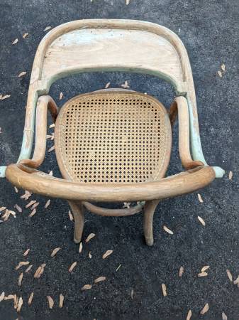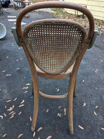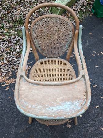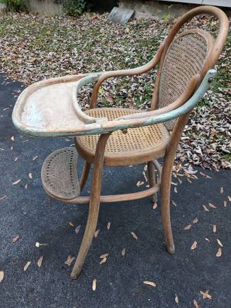 A 19th century childs high chair with a caned back and seat. It is very sturdy and the tray is fully functional. I have another one of these available if you have twins. Call 315-637-Seventeen...