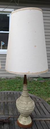 Two matching tall pottery and teak wood table lamps made in the 1950s with their original unique shades.
