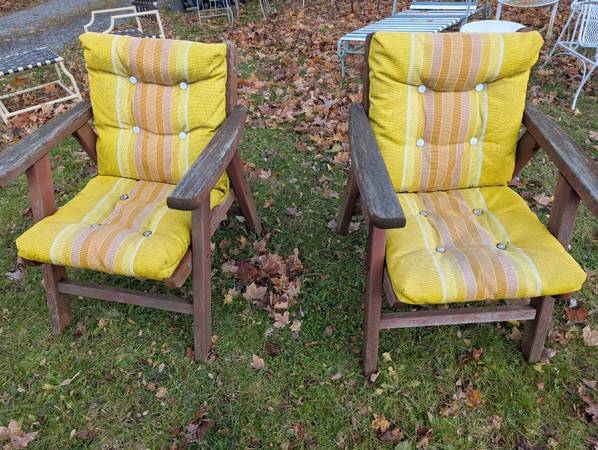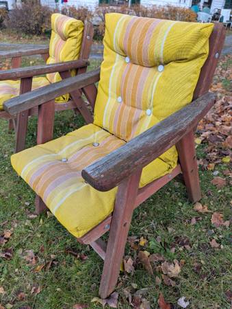 A pair of sturdy real Redwood chairs with attached all weather cushions. They're very comfortable and have years of life ahead of them. They measure 33 inches high, 25 inches wide and 28 inches...