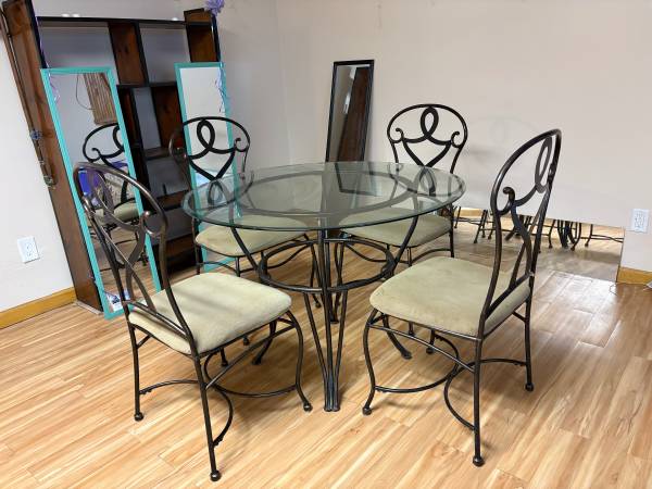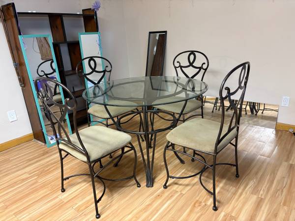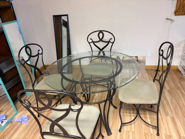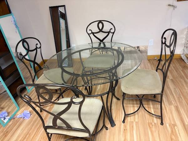 metal and glass 4 chairs and table kitchen set. no scratches or damage in glass or frames. Very solid set. 2 matching stools are available too ($50)