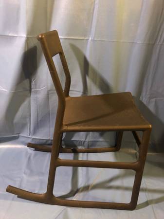 Selling a black plastic resin rocking chair. It is in good condition. Measures 32 inches tall by 13.25 inches wide back. Seat measures 16 inches wide in front by 16.75 inches front to back and 18 inches ground to seat. 26 inches long rocking arm bows.