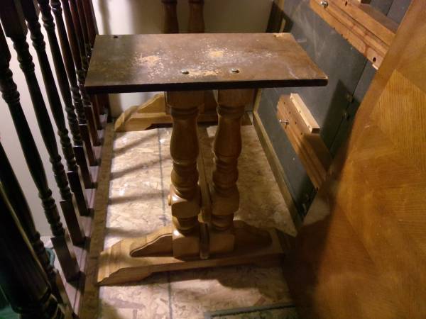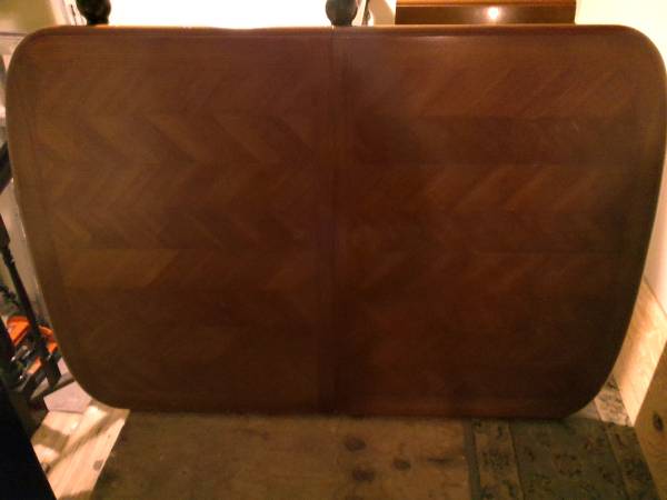 This vintage oak dining table with a herringbone design on the top needs to go to a new home. The top (without leaf) measures 40" x 60". The matching leaf measures 18" x 40". The table is currently disassembled as shown in pics and stands 28-1/2" high when reassembled. All hardware is included. No chairs, table only. Good condition with normal wear. $35 or best offer. PS: Bring help as the table top is very heavy.