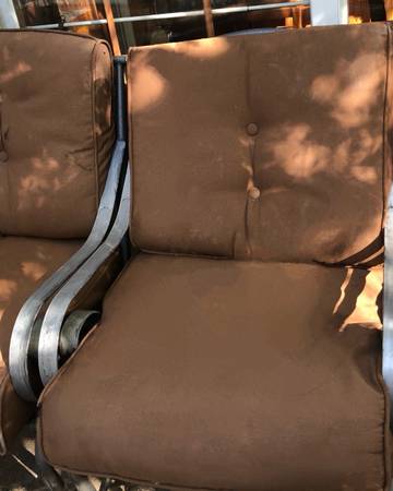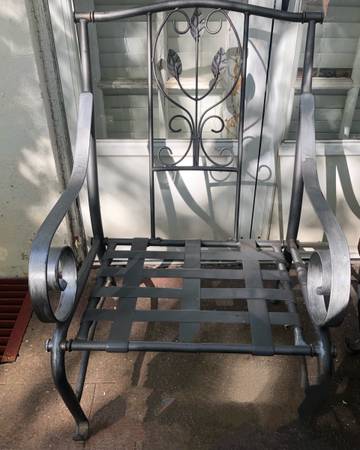 Martha Stewart Collection Five wrought iron patio chairs. Features decorative elements, such as the leafy scrollwork visible on the chair's backrest. $150 for set of chairs. Cash only.