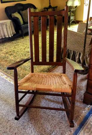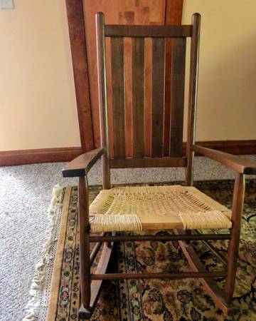 Troutman Chair Co. rocking chair, known for its sturdy construction and classic design. These chairs are designed for comfort with features like double scoop seats that contour to the body and curved back slats for ergonomic support, providing a "sweet spot" that hugs the body. Some fraying on seat but still sturdy & very comfortable.