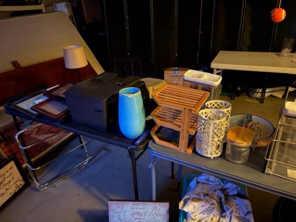 Items include bedroom set from 1940’s solid wood fair condition, 4 bar chairs, bike rack, Household items, Wall Decorations, holiday decorations, short men's clothing, women clothing, Outdoor and Garage items and so to much more!