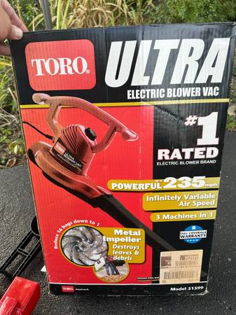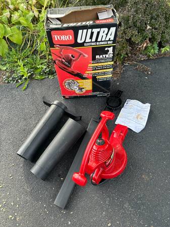For sale is a used, Toro Electric Leaf Blower. Works fine. I purchased a cordless, so I no longer use this one. I no longer have the cloth bag. (I never used it, and misplaced it)