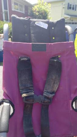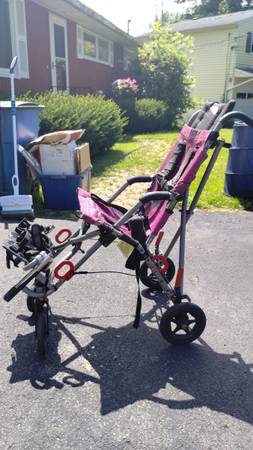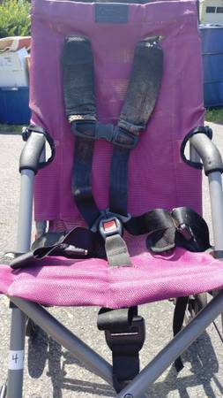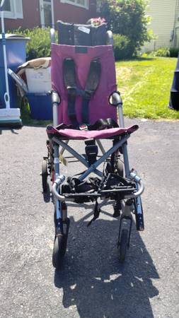 Very sturdy childs medical folding transport chair. Has extended back for taller child. Has a 12 inch seat. And removable foot plates. Folds like an umbrella stroller.