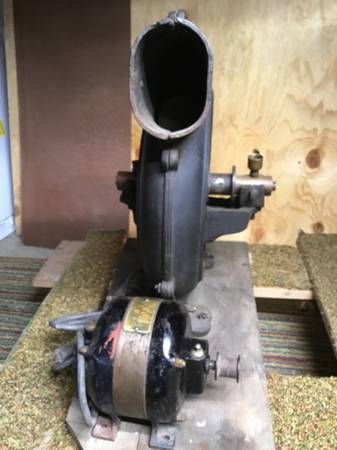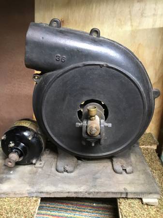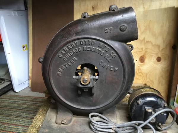 This forge blower was once a manual blower with a hand crank. Somewhere along the way it was converted so an electric motor could be used instead. It is in good condition considering its age. No visible rust, pitting or cracks on housing and blower freely moves without any grinding noises. The housing is approximately 16" in diameter. The bearing cups are missing their caps. The motor pictured is also included. Not sure it's the one originally used on this blower or not. It is an old GE 1/6th h.p. that runs at 1750 r.p.m. It too runs smoothly.