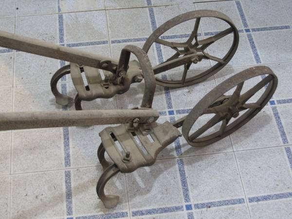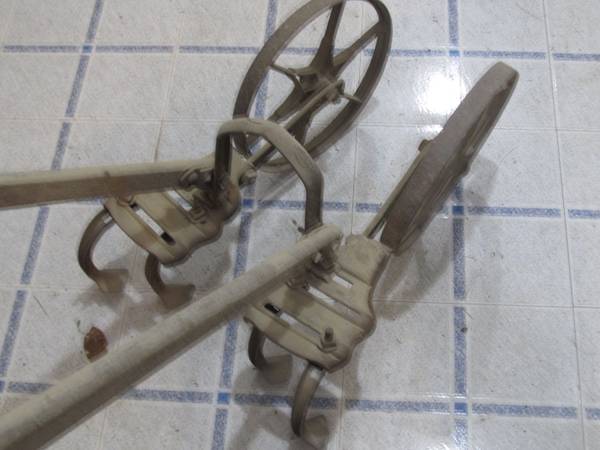 A vintage Planet Jr., dual wheeled hand cultivator. This is in good condition. The logos are still visible on the handles. These were quite popular in their time, frequently mentioned in gardening literature. While this would make a great heritage antique to display, if you have a mid-sized garden plot you could also put it to work against the weeds.
