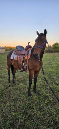 Earnest received 60 days of training in the spring and has been sitting since. He is a project and will need a complete restart under saddle as he is not confident with a rider above him. He is however dead broke/ dog gentle on the ground. Video is us pulling him out of the pasture & saddling him after sitting for months, and lunging him while his buddies all watched. He ground drives/ lunges great/ is desensitized on the ground/ trailers great/ stands for baths/ great for farrier/ great for blanketing/ fly spray etc. Bottom of the herd/ the horse we throw out with any new horses as he’s instant friends with *anyone*.