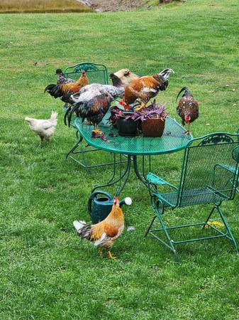6 month old Icelandic Roosters.These are a landrace breed that can fly like pheasants. Great at alerting then hens of hawks and foxes.Cold hardy and come outside when other chickens stay inside.