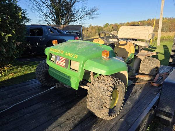John Deere Gator that runs and drives. It will need tires, a battery, and some tinkering to get it daily usable. It starts right up and goes forward and reverse without issue. The left side tires go flat in about 2 minutes, the right side hold air fine. The motor runs like a Swiss watch. It is very quiet and smooth. This is a beat up old Gator that runs and can be fixed back up. It also has a brand new clutch and belt.