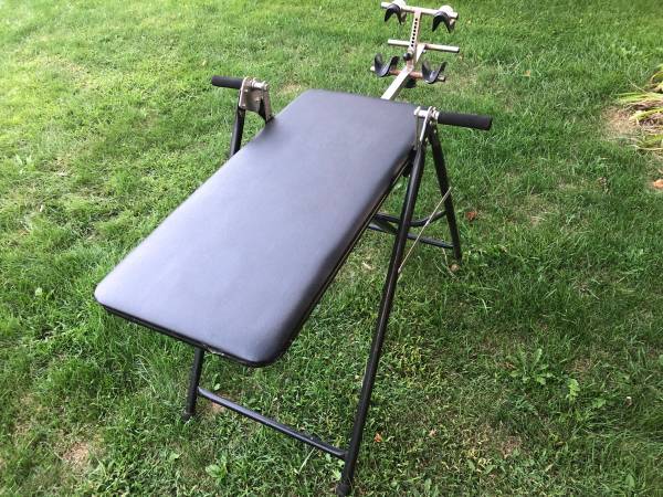 Inversion table in great condition. The back pad and ankle pads are in excellent condition, although there is some surface rust on the metal. Spacing to the feet is adjustable, and ankle clamp is...