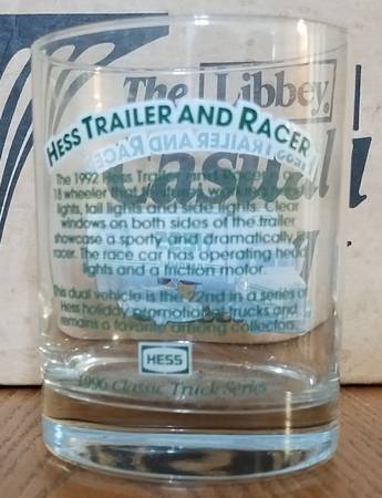 Bundle of nine original Hess toy truck glasses - all from 1996. Brand new unused, have been in storage since the 90s. 4 - Hess Racer and Trailer 4 - The First Hess Truck 1 - Hess Fire Truck Bank...