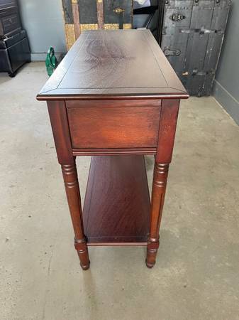 Please find a used console table with a cherry finish and 2 drawers. I am unsure of the maker. This table is 3 ft. wide, almost 2 ft. deep and stands 2 ft. tall. It is a light weight table. Please see the photos as shown.