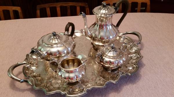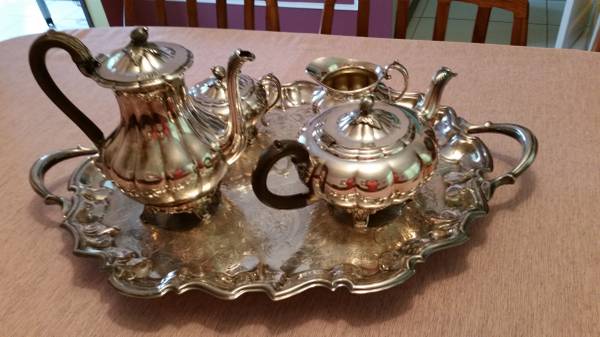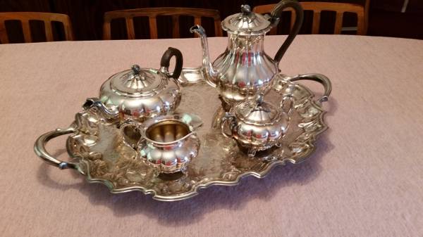 Price reduced! Vintage set in very good condition. $20. Period piece that has all original components--coffee, tea, sugar, creamer, and elegant raised tray. Tray can be used separately from serving set. See photos. Downsizing so we no longer have space to display.