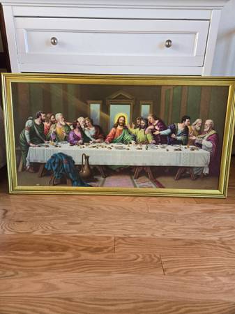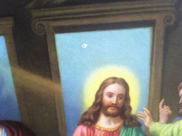 Has a small imperfection above the head of Jesus, please see pic. It is not an old picture, but it has a vintage vibe to it and is awesome for a gallery wall or dining room.