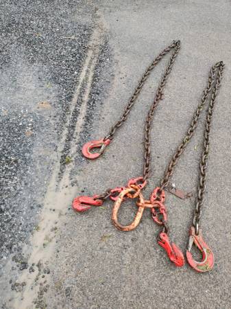 • 4 way heavy duty lifting chains 3/8” with safety hooks. 20’ long. Rates 18,400 lbs with adjusters. Asking $800. • 2 sets 2 way heavy duty lifting chains 1/2” with safety hooks with adjusters. 10’...