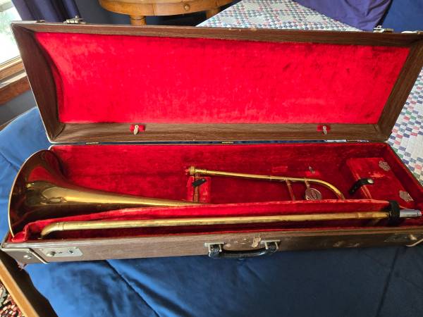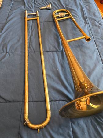 Nice Bundy/King Student model trombone! Great instrument for your student-aged musicians in elementary, middle, or high school, or the adult learner! Instrument works great, lacquer does show some wear and tear, but instrument is generally dent and ding free! Comes with mouthpiece and used slide grease. Cash only, please.