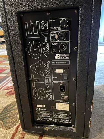 db technologies- Stage Opera 42-12 Powered Speakers, 2x12 inch plus a horn on each powered speaker. These were built in Italy and are super high efficiency speakers that are 400 watts RMS each and deliver very high SPL. They have plenty of headroom plus a built in limiter for protection. Fully functional, all drivers in good shape and internal amps are working great. minor scuffs from typical use as seen in pics. Please email me if interested. Thank you