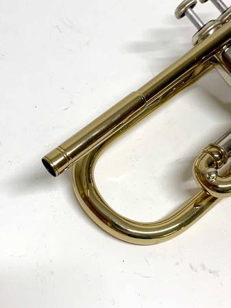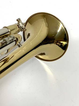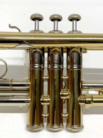 CONDITION: Cosmetically excellent. This instrument was overhauled many years ago. I'm not sure who did the overhaul and relacquer, but I expect it was Allied Supply Co. I suspect that the receiver was replaced, and possibly the leadpipe, although I've seen at least one other NY Bach with this kind of receiver (cylindrical tip rather than hexagonal.) But since the receiver is not a stock Bach part, it is safer to assume that both it and the leadpipe have been replaced. The replacement lacquer is about 100%, with no losses that I can see. The 3rd-slide throw has its original stop nuts. I see no corrosion anywhere. The pistons are quite tight with good action and minimal blow-by, although the springs are quite stiff for my liking and I'd probably replace them with lighter springs. The 3rd-slide throw is short and rather stiff so it may need lapping and adjustment. The bell flare has a slight ripples from dent repair and one small ding near the rim. There is a protective patch on the bell throat where it rests on the left index finger. The instrument is sold AS-IS with no warranties. See pictures. WYSIWYG.