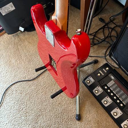 To start, the electronics were completely replaced with a Fender USA Tex-Mex prewired pickguard. The string trees have been swapped for rollers. The plastic nut has been swapped for bone (glued in for stability). Tuners have been swapped for locking.