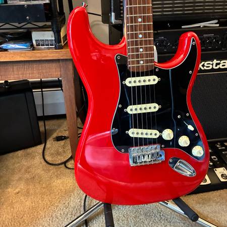 Base features for this guitar include a full-thickness solid Stratocaster body with maple neck and rosewood fretboard. 25.5” scale length with 21 frets, 12” radius, and a somewhat thick C-shaped neck profile.