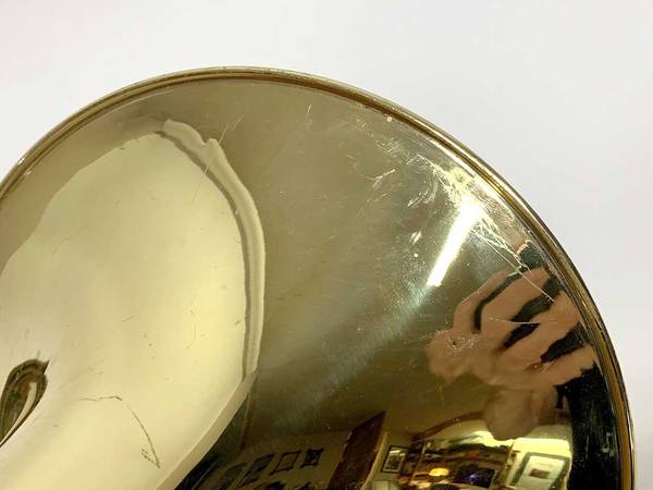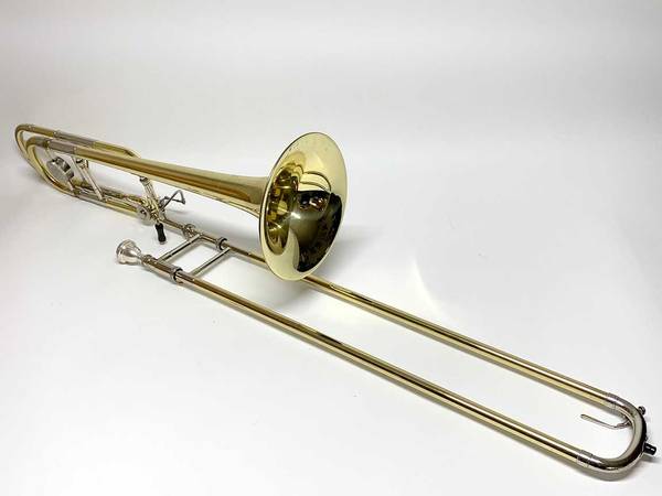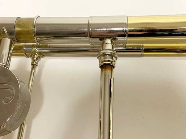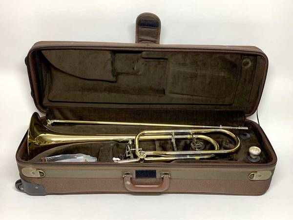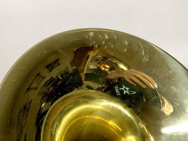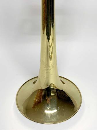 CONDITION: Very good overall. The lacquer is about 95%+, with minor wear and scratches. There are some small dings and dents scattered around the instrument, and a dent repair to the main tuning slide bow. There have been a couple small solder joint repairs, with minor burning of the lacquer, hardly noticeable. There is a little bit of plating loss on one inner handslide stocking. The slide feels a bit gummy and could no doubt use a professional cleaning, which I will leave to the new owner. The instrument is sold AS-IS with no warranties. See pictures. WYSIWYG.