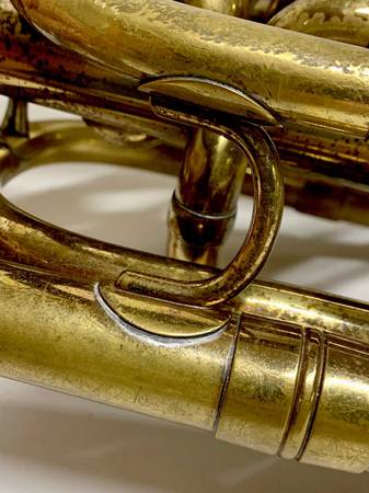 CONDITION: Good playing condition and fair-good cosmetic condition overall. The original lacquer finish is worn about 60%. There are a number of dents, primarily to the bell throat, and scattered dings on the bell bow and first branch. Nothing that affects the playability, though. The pistons show some plating loss but seem to still be pretty tight. All slides pull. It will need cleaning, polishing, and lubrication; I'll leave that to the new owner. No mouthpiece–it accepts a standard-shank trombone mouthpiece. No case–the previous owner carried it in a vintage Drakkar Noir duffel bag that seems to fit it pretty well. The instrument is sold AS-IS with no warranties. See pictures. WYSIWYG.