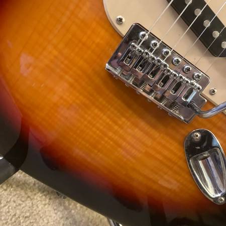 Features for this guitar include a full-thickness Strat-style body (wood used uncertain), with what appears to be a flame maple top, and a gloss maple neck and fretboard (22-fret). SSS-pickup, 1V2T&5Way electronics layout. 10mm sealed tuners. 25.5” scale.