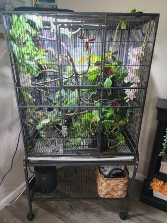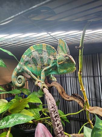 1 year old veild chameleon. Male. Cage and all supplies come with. It is a large flight cage. Unsure on dimensions as I do not have a measuring tape. Est about 5 ft tall, 2.5×2 feet wide. Please only respond if you are familiar with Chameleon care as they are not for beginners. Rehoming fee of $200.