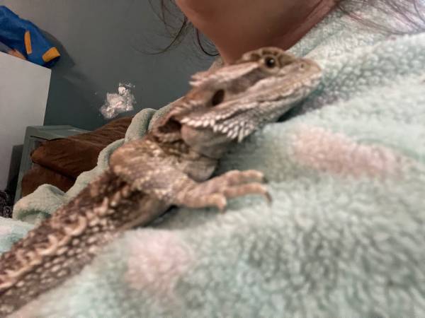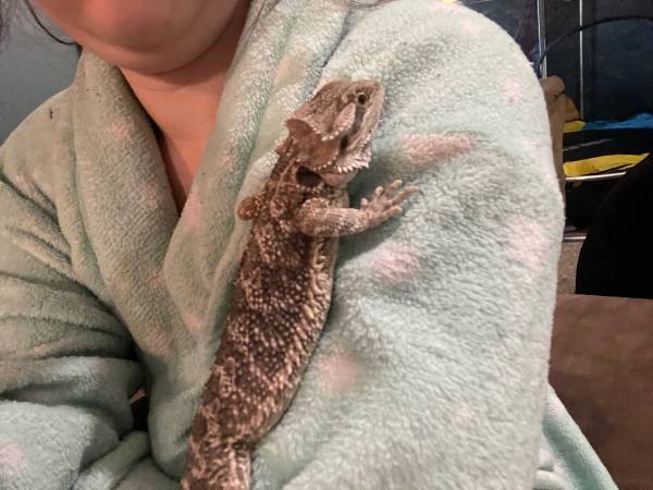 Hello! I have a bearded dragon currently who I need to rehome. He is about a year old, very friendly and loves the water. He does extremely well with kids. He comes with his food and water dish along with his cage and his mat( not in the photos as it’s being cleaned). Serious inquiries only. Pick up preferred.