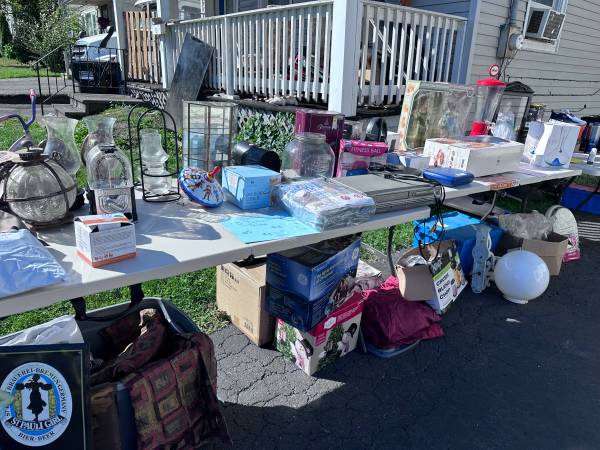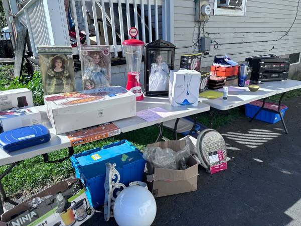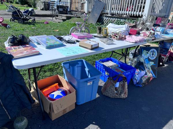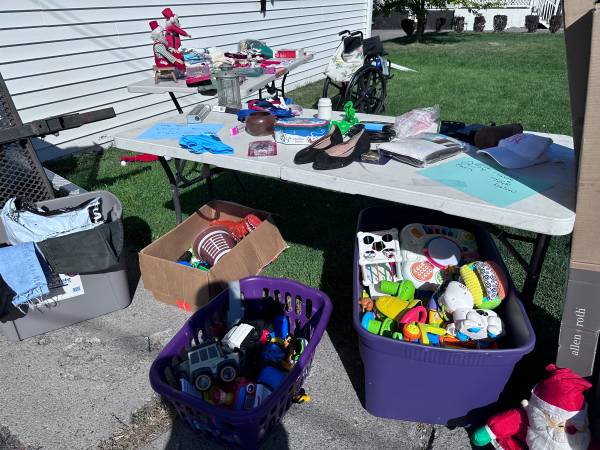 Toddler toys, toddler boys clothes- vary from 6 months to 24 months. Keurig, bar lights and signs, wheel chair, electric turkey cooker, girls mountain bike, ( white)