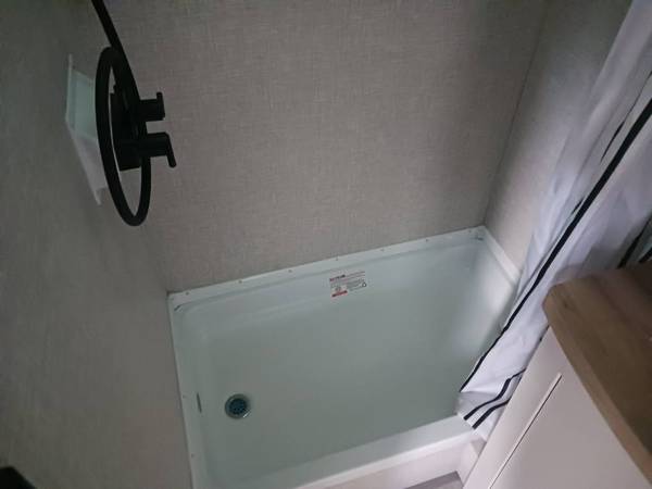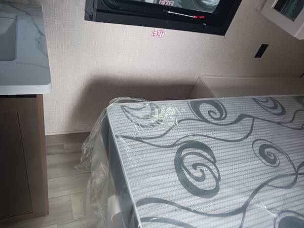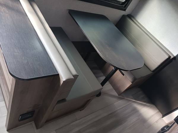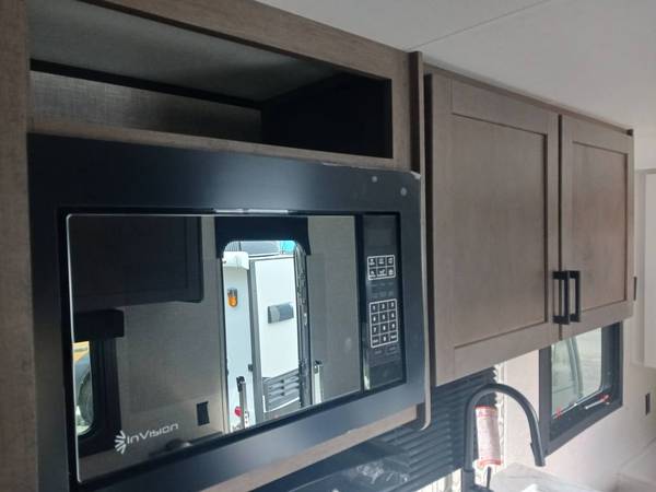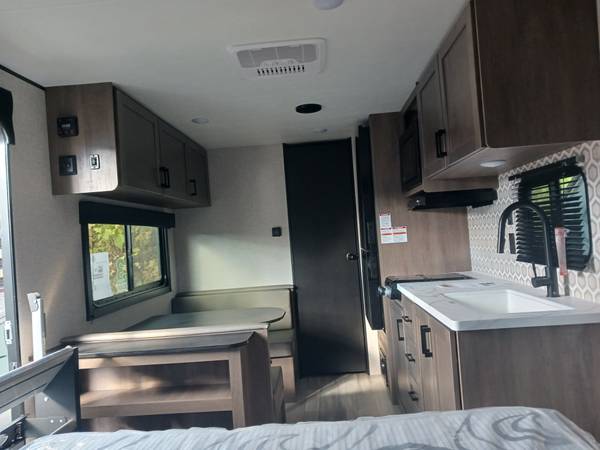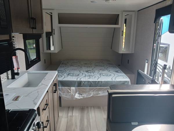 Sleeping three people comfortably, this trailer features a front walk-around bed and booth dinette. The full rear bath includes a foot flush toilet, powered bath vent, and bath wardrobe for all your essentials. The kitchen is fully equipped with a two burner cooktop, microwave oven, and refrigerator to keep your food fresh during your travels.