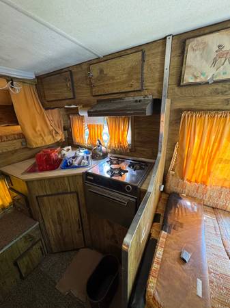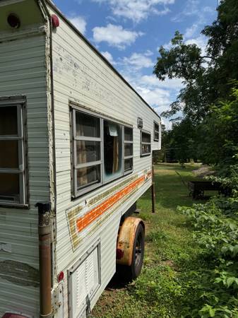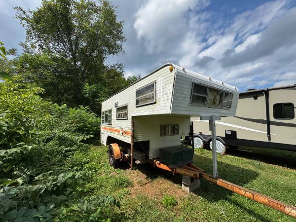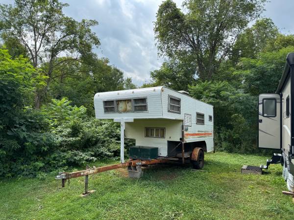 This 11.5 foot truck camper is mounted on a large boat trailer for easy towing and use. It could be towed with a smaller pickup or SUV locally. It has a catalytic heater, gas light, and is wired for two deep cycle rv batteries for remote use, also can hook to generator and has 100v outlets inside. The conventional furnace and refrigerator worked last hunting season. Stovetop works perfect, oven has not been lit in a few seasons. There is a closet large enough for a portable toilet and some storage. Can sleep 3-6 depending on your size and tolerances. Front was sealed up with flex paint before last hunting season and has not leaked. Truck camper could be removed and slid into an 8ft bed on a large truck. Boat trailer is a transport trl 1981 Calkins drive on roller bunk for heavy boats. All hardware for both can be taken if desired. >CASH ONLY< serious inquiries only, serious cash offers considered. Sold as is and final. Questions can be answered since there is a lot to this set up-we have hunted out of this for 40+ years. email or text number provided