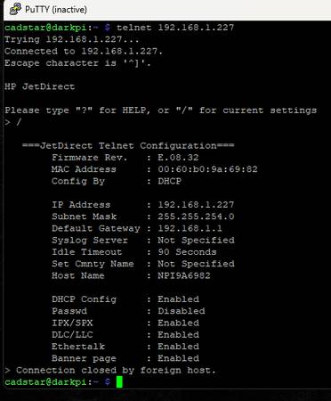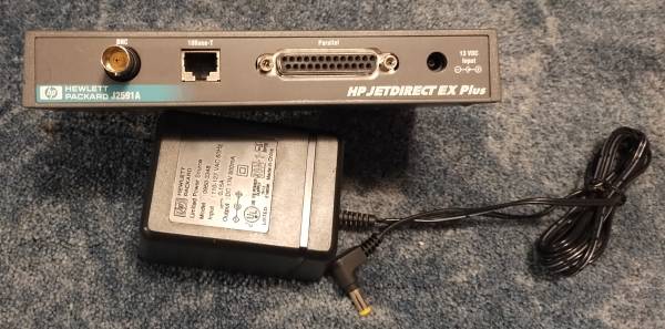 The J2591A is an early model supporting 10 BaseT networking only using the modern standard of RJ45 jacked network cable or the older BNC type connector cable. Access to settings is had through telnet connection (see photos), it does not feature a web browser based setting page.