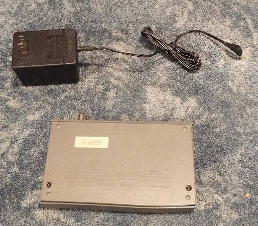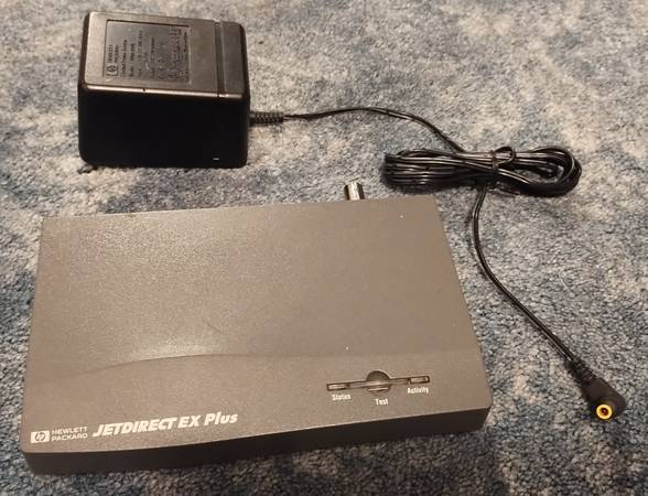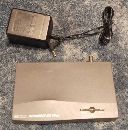 This is an HP print server - takes any standard non-networked parallel printer and gives it full network connectivity. Back in the day these were everywhere - every office used them to make printing easy and convenient.