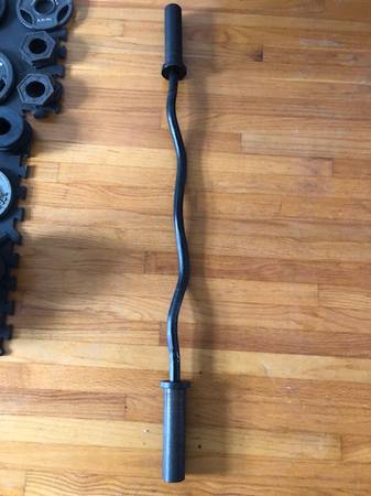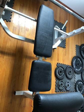 Selling: - Powerhouse 3-position inclined weight bench with leg extension. No rips/tears/rust/dents/scratches - Olympic bench press bar, 45 LB, with locking collars - Olympic curl bar, 25 LB, with...