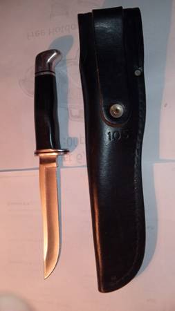 Knife, "Bowie" #105, 5"lg. Fixed blade, Pathfinder,with leather sheath. Like new...! $60 FIRM. No trades...! Delivery and/or shipping avaiable at buyer's expense. Message me in here for more...