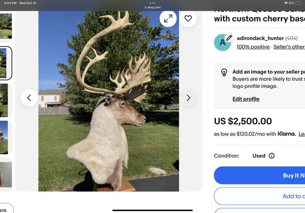 I have for sale an exceptional Northern Quebec Caribou pedestal mount from a caribou legally harvested from the northernmost part of Quebec within the Arctic Circle. This herd is no longer huntable due to a declining population. This mount was done by a master taxidermist and is graded as excellent. This bull was an absolute stud! He has a shovel and bez like no other. I’ve seen many caribou but have never seen one with this much character. The hide is in great shape, like all caribou - the hair is hollow and will shed when brushed. This mount has been appropriately cared for. I’m renovating my home and no longer have the room for this mount. Caribou mounts cost thousands of dollars, caribou hunts can approach ten thousand dollars. Item is local sale only, or I would entertain freight arranged by the buyer. The cherry base was custom made by a local wood crafter for this mount and is made from real cherry. The base does have 2 splits at the bottom (see photos). This item comes from a clean, non-smoking household. Please see my other taxidermy sales for some other excellent specimens. Thanks for looking, happy hunting to you!