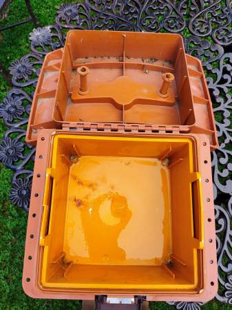 For Sale $20.00 Fenwick Woodstream Tackle Box Seat Sports seat 9050 THIS HERE IS AN OLD FISHING TACKLE BOX SEAT. SOLID GOOD SHAPE. A LITTLE DIRTY, ESPECIALLY THE COOLER. APPROX 15 X 12 X 8.