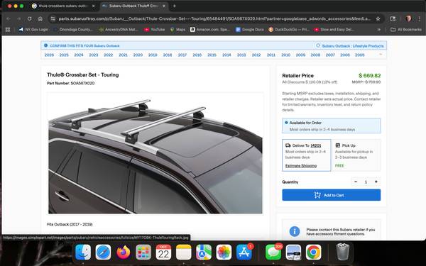 Like new Thule Crossbars for Subaru Touring all parts and keys. Scarcely used I think they were only on the car once. WE traded the car in, no longer needed. As you will see from the photos $225 is...