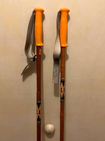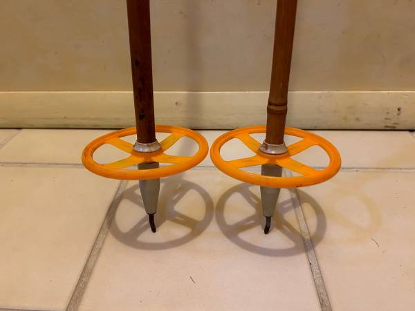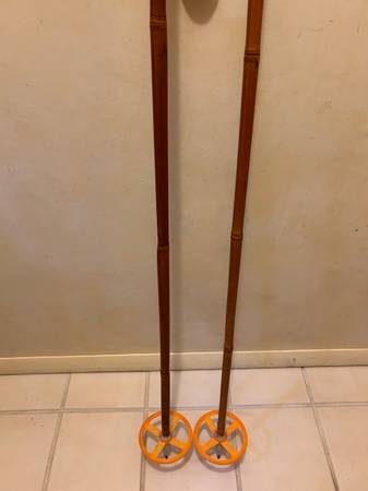 Selling a pair of vintage 1970s Liljedahl bamboo cross country ski poles for $30. The classic Norwegian ski poles are 55 inches and in ok condition. Poles have orangish yellow hand grips and baskets. They have leather straps. Use them or display them.