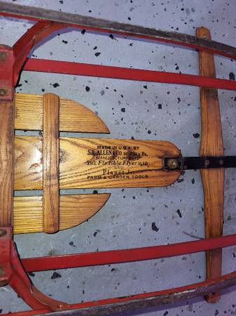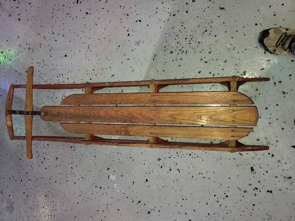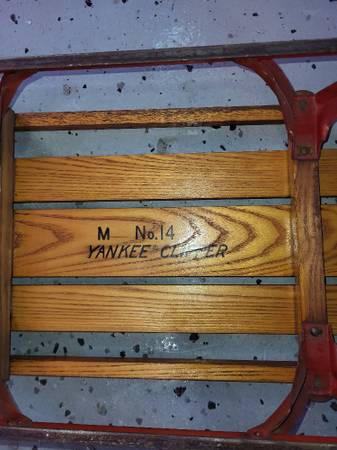 Yankee Clipper Model No. 14, 57" long. This was my sled as a kid in 1960. Top side is weather beat, but everything is 100% solid. Bottom side is clean and clear as you can see. CASH PICK UP IS...