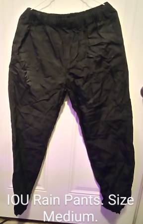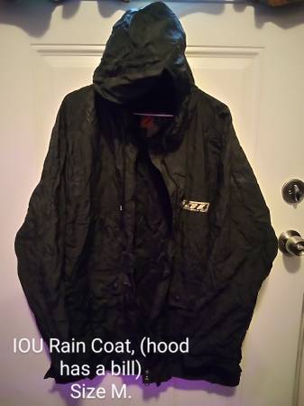 1 IOU rain jacket with hood with bill and rain pants adjustable ankles both size mediums