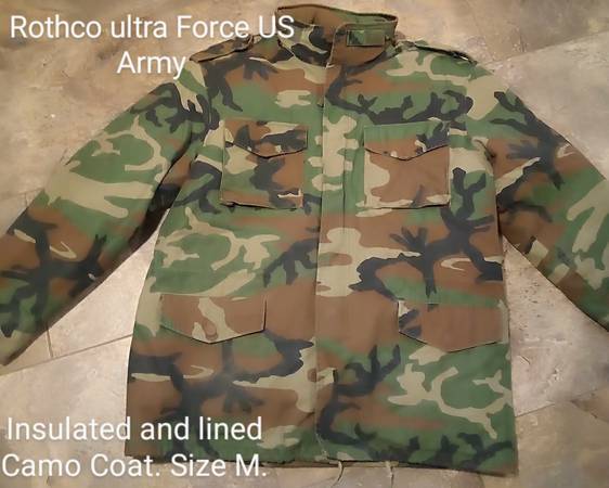 1 Rothco ultra Force US army men's field coat with detachable liner missing buttons the coat snips snaps and zips hood is concealed inside the collar size medium